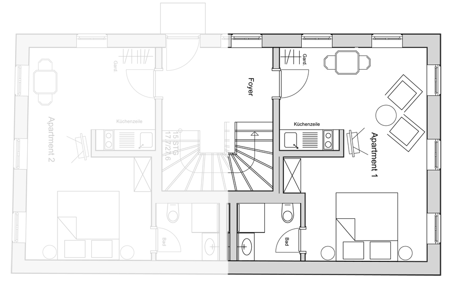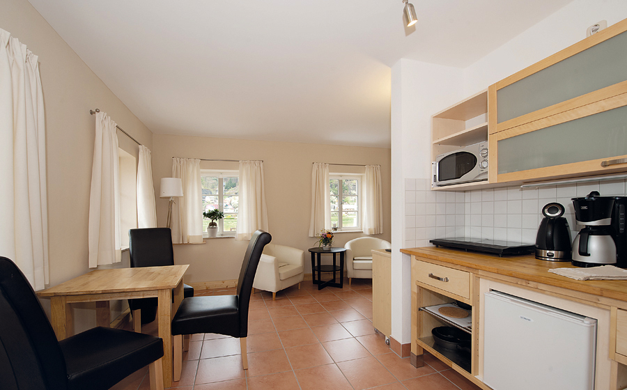 Apartment mit Doppelbett, Sitzecke, Esstisch, Küchenzeile, TV, Terrasse und Du/WC im Erdgeschoss.