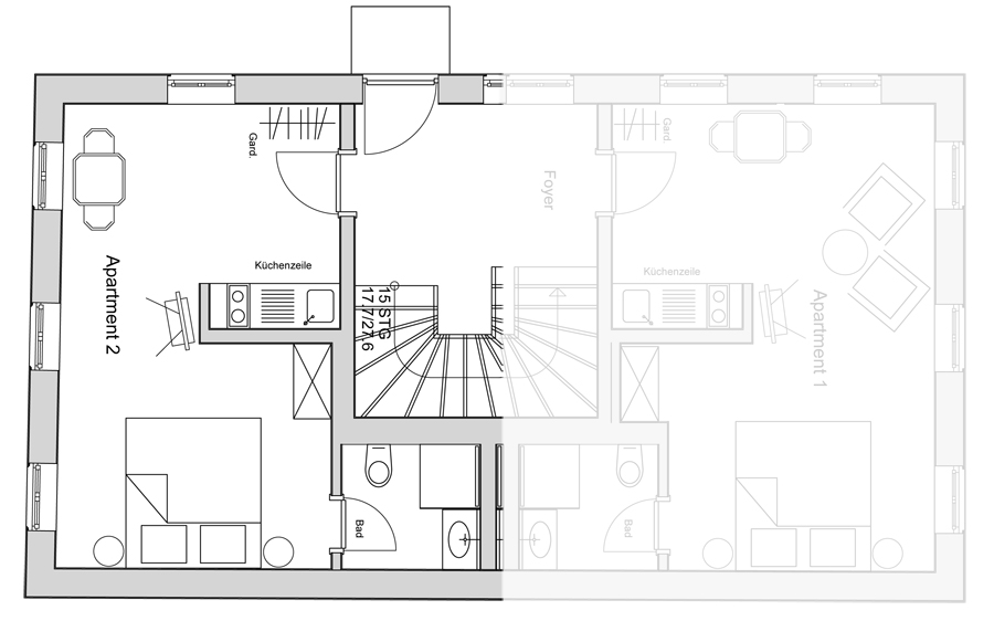 Apartment mit Doppelbett, Esstisch, Küchenzeile, TV, Terrasse und Du/WC im Erdgeschoss.
