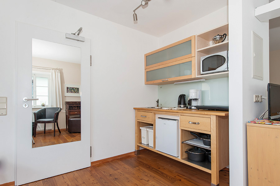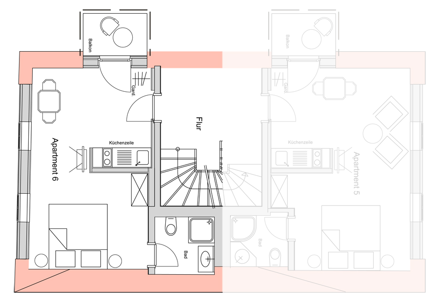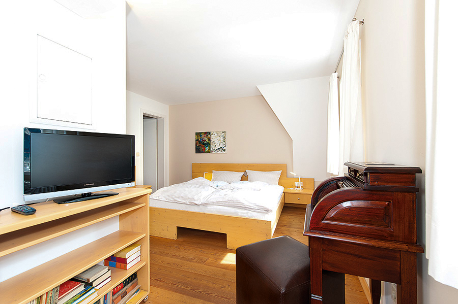 Apartment mit Doppelbett, Esstisch, Küchenzeile, TV, Balkon und Du/WC im Dachgeschoss
